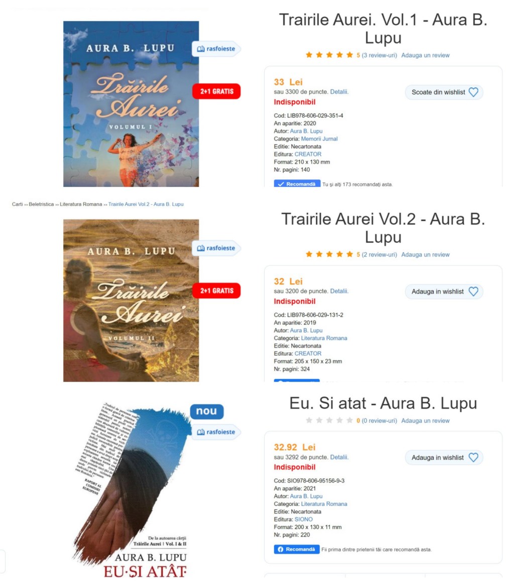 și-n librăriile din țară, iar „Trăirile Aurei”, chiar dacă momentan pe Libris este stoc epuizat, o găsiți și pe alte site-uri
