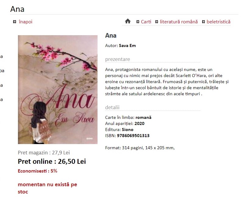 N-am avut prea mult timp să mă uit pe net, azi am dat așa, o geană, și am rămas paf. Ultima apariție „Trăiește. Iubește. Și taci” la Cărturești e indisponibilă, stoc epuizat, primul volum din „Trăirile Aurei” nu apare defel, în stoc sunt încă romanul „Eu. Și atât” și al doilea volum „Trăirile Aurei”, la librăria Mihai Eminescu la fel, stoc epuizat pentru „Trăiește. Iubește…” și mai este un ultim exemplar al romanului, pe Libris sunt trei dintre cărți dar romanul nu mai apare. La librăria Gaudeamus din Cluj-Napoca singura carte Siono este cea a lui Em Sava, Ana, dar tot stoc epuizat și la ea.