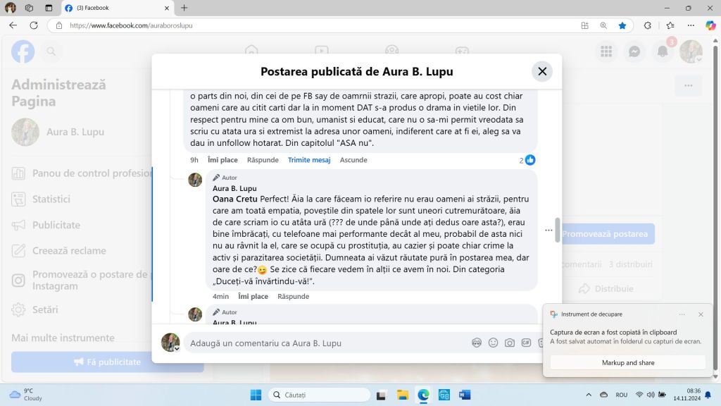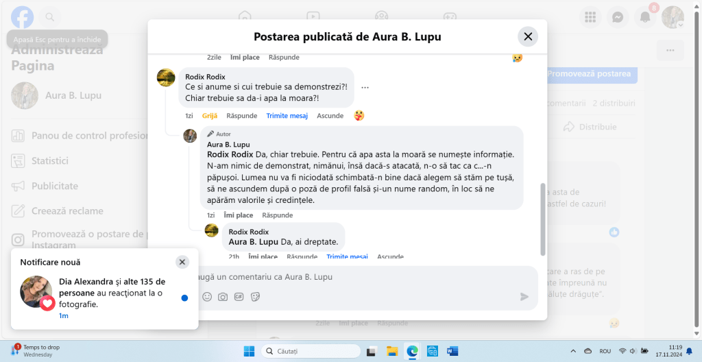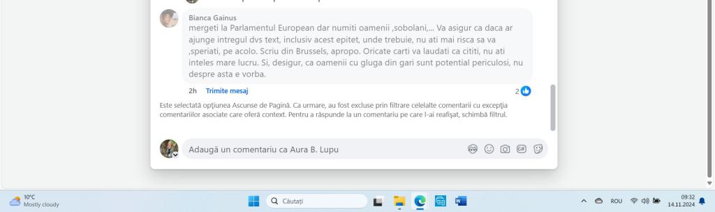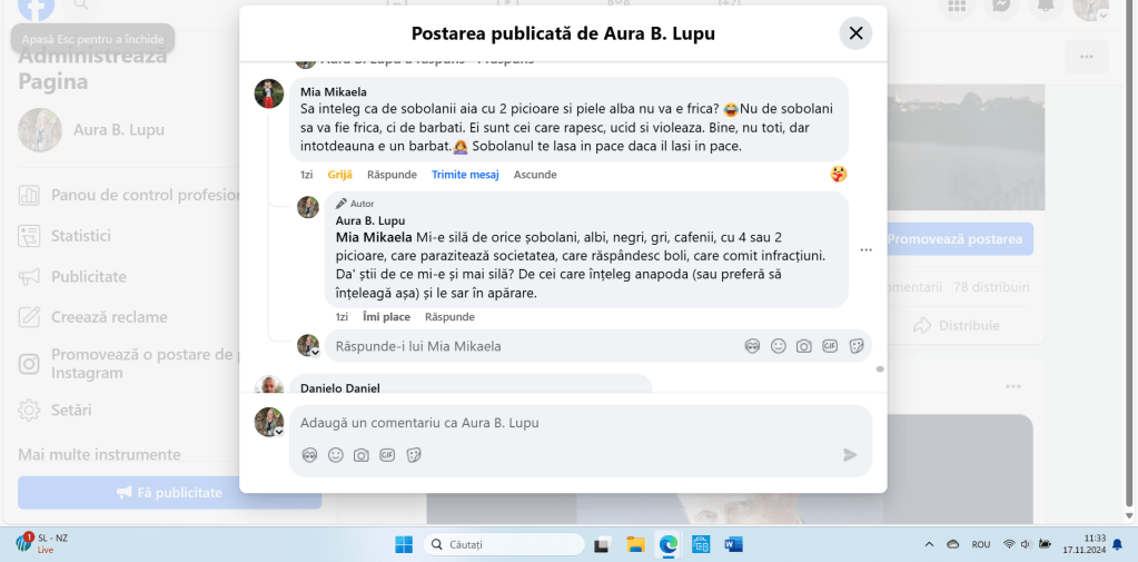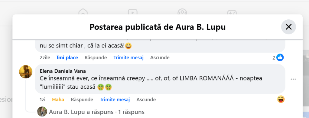 Nu mă laud cu nimic. Nici nu pretind c-am înțeles mai multe sau mai puține decât mătăluță. Știu însă sigur că infractorii, violatorii și criminalii nu-s pe placul meu. Și nici șobolanii. Era o metaforă, nu un epitet. Pentru un artist vizual, cum scrie la profil c-ai fi, credeam că-i evidentă diferența. Poți scrie de unde vrei, și din Honolulu, nu doar din Brussel, că nu mă impresionează asta în mod deosebit. Dar, poate c-ar trebui să revii la propria postare: „Nu vei înțelege niciodată până nu ți se va întâmpla.” Și mai ușurel cu amenințările voalate. Numa’ zic. ![]()
