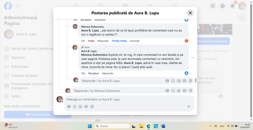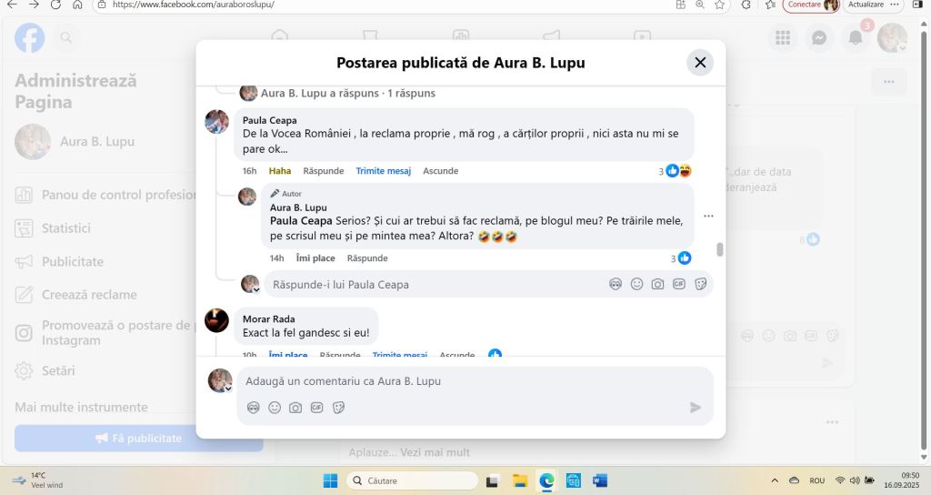 Atâta timp cât ceea ce scriu și împărtășesc aici, pe Aura B. Lupu, e absolut GRATIS și benevol intră fiecare pe pagina asta, fără să fie tras cu japca și obligat să citească ceea ce scriu, îmi rezerv dreptul de-a face reclamă cărților scrise de mine. Nu că asta m-ar îmbogăți, din drepturile de autor nu mi-am cumpărat nici vile și nici n-am călătorit pe Lună, nici măcar facturi n-am putut plăti cu ceea ce-am primit de la edituri.